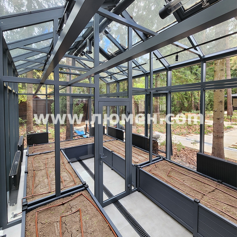 Особенности: Оранжерея изготовлена из профильной системы «Alutech». Для увеличения энергоэффективности в конструкции использованы энергосберегающие стеклопакеты. Стеклопакеты не задерживают ультрафиолететовое излучение, что не препятствует вегетации и росту растений. Для разделения конструкции на две зоны выращивания установлена перегородка с дверью. Проветривание в теплое время осуществляется через четыре наклонных люка открывающиеся и закрывающиеся по температуре внутри помещения.